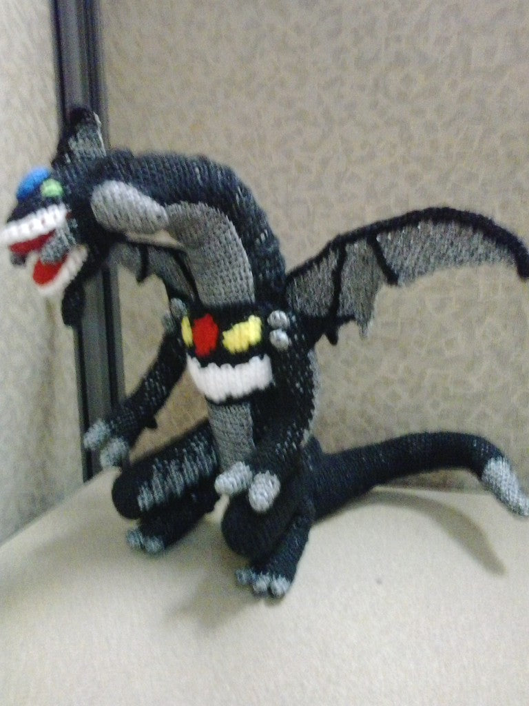 This is an Amigurumi plush inspired by Dark End Dragon from the Yu-Gi-Oh card game and shows. Dark End Dragon and Yu-Gi-Oh are copyright Konami and their respective creators.
