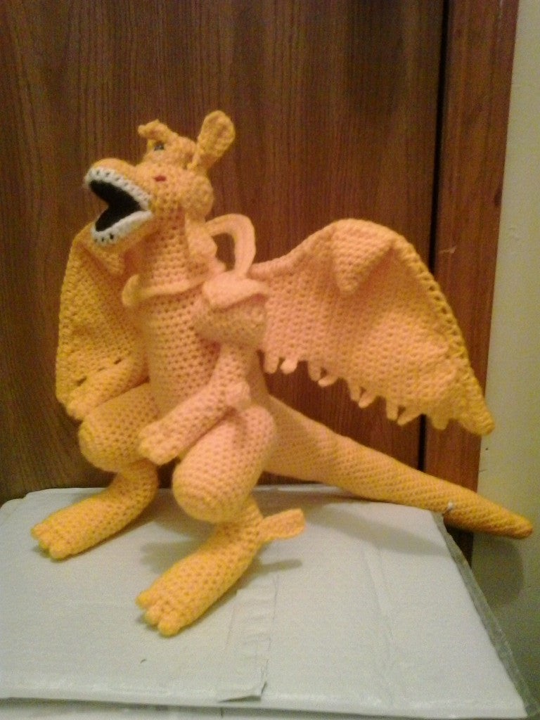 This is an Amigurumi plush inspired by the Winged Dragon of Ra from the Yu-Gi-Oh card.game and shows. Winged Dragon of Ra and Yu-Gi-Oh is copyright Konami and their respective creators.
